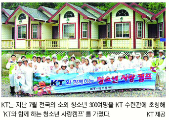 KT는 대구지하철 참사, 중부지방 폭설, 태풍 나비 피해복구 등 국가적인 재난·재해 구호에 어느 기업보다 도드라진 활동을 한다. 전국 농어촌 초고속인터넷 보급과 정보화 마을 조성에 큰 기여를 하고 있다. 저소득층과 저개발 국가에는 개인용컴퓨터(PC) 수천대를 기증하고 있다. 어르신을 위한 인터넷 교육, 장애인 정보화에도 앞장서고 있다.KT는 이를 위해 2001년 ‘사랑의 봉사단’을 발족했다. 임·직원의 35%인 1만 3000명이 전국 111개 지사에서 활동하고 있다.KT는 또 임·직원이 자발적 참여로 조성한 ‘사랑의 나눔기금’을 청각 장애인 소리 찾기 등에 사용하고 있다.