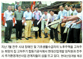 이 회사 사회공헌 활동의 중심에는 김달훈 전략기획팀 부장이 있다. 그는 회사 여직원들과 봉사단체를 찾아다니다 때마침 아이파크 봉사단이 창설되면서 봉사단 업무를 자원했다. 사내 인트라넷을 통해 사회공헌 활동에 참여할 수 있도록 봉사활동을 마련해 공지하고 신청을 받아 업무를 나누는 기획총괄을 맡고 있다. 올들어 서울 금호동 2가 성동장애인 종합복지관 제 3가정 개·보수 작업을 시작으로 현재까지 창성동에 하상복지관 라파엘 그룹홈, 수유동 한빛맹아원 등 복지시설 20여곳에 대한 개·보수 봉사를 했다. 하반기에는 하계동 ‘동천의 집’ 등에서 봉사활동을 펼 계획이다.