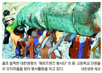 대한생명은 미래의 고객인 청소년들의 봉사활동을 조직적으로 관리하는 것이 특징이다. 지난 1월 중·고등학생 350여명으로 구성된 ‘해피프렌즈 봉사단’이 발족됐다.10명으로 이뤄진 셀(cell)이 중심이며 대학생 자원봉사자가 셀 팀장이 돼 한달에 1∼2차례 봉사 활동을 한다. 저소득층 아동과의 자매결연, 오지마을 행복 만들기 활동 등을 진행한다.