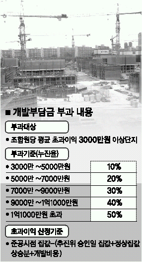 개발부담금은 조합원당 평균 초과 이익금이 3000만원을 넘을 때 부과된다.3000만∼5000만원은 10%,5000만∼7000만원 20%,7000만∼9000만원 30%,9000만∼1억 1000만원 40%,1억 1000만원 초과분은 50%다. 조합원당 평균 초과이익이 2억원인 경우 조합원 한 명당 6500만원 정도를 내야 한다. 부담금은 준공 시점에 재건축 조합에 부과된다.