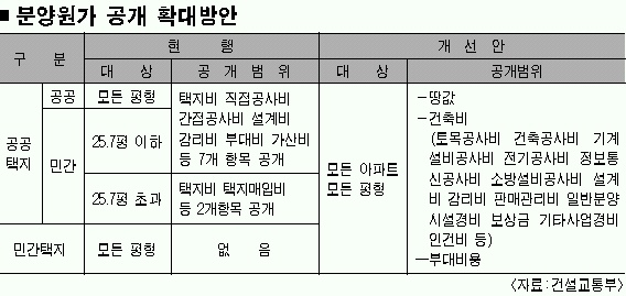 분양가 공개는 공공·민간 아파트 가리지 않고 모두 적용된다. 공개 범위도 현행 분양가상한제가 적용되는 아파트의 경우 땅값을 포함해 7개 항목에 걸친 개략적인 원가만 공개하지만 앞으로는 세부적으로 소비자들이 훤히 들여다 볼 수 있도록 세부 항목으로 나눠 밝혀야한다.