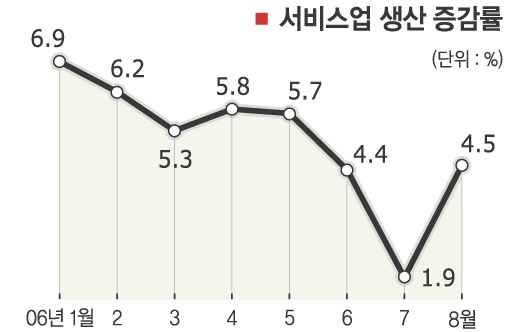 도·소매업도 1년전보다 3.5% 증가하는 데 그쳤다.▲지난해 4·4분기 평균 3.4% ▲올해 1분기 3.3%로 감소하다가 ▲2분기에는 3.8%로 호전됐다. 하지만 8월들어 자동차 판매의 감소 등으로 상승세로 반전하지는 못했다.