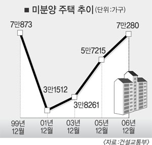 건설교통부가 2일 발표한 ‘2006년 7월 말 현재 전국 미분양 주택 현황’에 따르면 전체 미분양 주택은 7만 280가구다. 외환위기 직후인 1999년 말(7만 873가구) 이후 가장 많다.