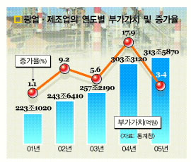3일 통계청이 발표한 ‘2005년 광업·제조업 통계조사(잠정)’에 따르면 지난해 광업과 제조업의 부가가치는 313조 5870억원으로 2004년보다 10조 2750억원 늘었다.3.4% 증가한 것으로 2004년의 17.9%에 비하면 14.5%포인트나 감소했다.