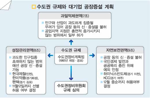 1982년에 제정된 수도권정비계획법은 수도권을 과밀억제권역과 성장관리권역, 자연보전권역 등으로 나눠 규제하고 있다. 과밀억제권역은 인구와 산업이 과도하게 집중됐거나 그럴 우려가 있는 지역으로 공장 신·증설을 불허하고 있다. 다만 기존 공업지역의 총면적을 증가시키지 않는 범위에서 수도권정비위원회의 심의를 거치면 공업지역 지정이 가능하다.