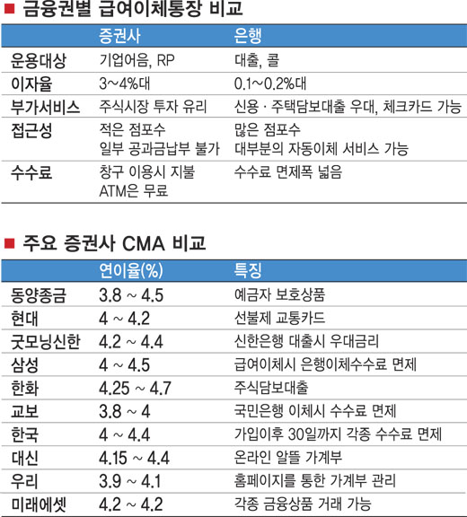 증권사의 자산관리계좌(CMA)가 은행 급여이체 통장에 비해 높은 금리를 제공하면서 월급통장을 갈아타는 직장인들이 늘고 있다.CMA는 우량기업어음이나 환매조건부채권(RP) 등에 투자, 높은 금리를 보장하면서 수시입출금 기능을 갖췄다. 다소 불편할 수 있지만 높은 수익을 추구하는 직장인들에게 인기가 높다. 이에 은행들은 자체적으로 CMA와 은행의 급여이체통장을 비교하는 자료를 만드는 등 방어에 나섰다. 증권사도 이에 뒤질세라 주식담보대출, 선불교통카드 등 CMA에 다양한 서비스를 추가하고 금리를 더 받을 수 있도록 상품 구조와 투자 대상을 바꾸고 있다. 급여이체통장을 둘러싼 은행과 증권사 안팎의 경쟁이 한창이다.