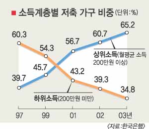 또 1997년에 월평균 가구 소득이 200만원 이상인 고소득가구 가운데 저축을 하고 있는 가구의 비중은 39.75%였으나 2003년에는 이 비중이 65.2%로 높아졌다. 반면 월 평균 가구소득 200만원 미만의 저소득가구에서 저축가구의 비중은 같은 기간 60.3%에서 34.8%로 떨어졌다. 이처럼 소득계층별 가계저축률 격차가 확대된 것은 ▲고소득계층이 저소득계층보다 불확실한 노후 대비 등에 상대적으로 관심이 더 많은데다 ▲국민연금 등 강제저축 증가로 저소득계층의 개인저축이 고소득계층에 비해 더 크게 줄어들고 ▲고소득계층보다 중·저소득계층의 가계부채 상환 부담이 더 큰 데 원인이 있는 것으로 분석됐다.