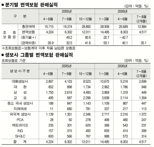 31일 금융감독원에 따르면 변액보험은 올해 1∼3월 판매실적이 1조 4495억원으로 사상 최고치를 기록했다. 그러나 그 이후 주식시장이 큰 폭의 하락 및 조정을 지속한 데 따른 변액보험 수익률이 낮아져 4∼6월에는 46.8% 감소한 8303억원에 그쳤다. 이어 7∼8월에는 4517억원으로 큰 폭으로 감소했다. 지난 3∼6월 변액유니버셜보험 판매 실적도 1774억원으로 전분기 대비 22.7% 줄어들었다. 지난 6월말 현재 주식 및 혼합형 변액보험 펀드도 총 180개 가운데 175개가 3개월간 손실이 발생하는 등 고전을 면치 못했다.