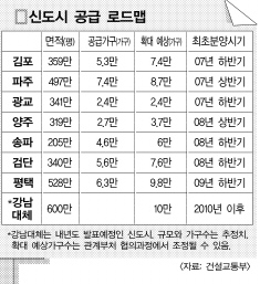 정부는 우선 분당(㏊당 197명), 평촌(329명)에 비해 개발밀도가 지나치게 낮은 신도시 가운데 송파(170명), 김포(130명), 양주(130명), 평택(90명), 검단(133명), 파주 3단계(110명) 등 6곳의 밀도를 ㏊당 30∼50명씩 상향 조정키로 했다. 신도시 중 이미 실시설계가 거의 마무리된 파주 1·2단계나 광교 신도시는 제외된다.