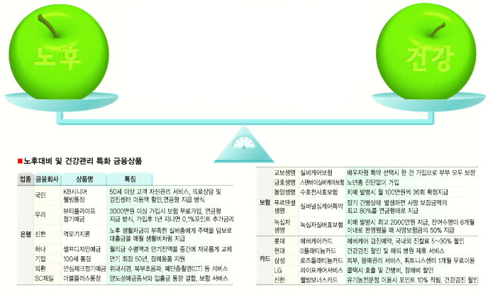 고령화가 진행되면서 안정적인 노후생활을 바라는 중·장년층을 겨냥한 금융상품이 봇물을 이루고 있다. 시중은행에서는 안정적인 수익을 추구하며 건강서비스가 가미된 장기 연금형 상품을 주로 팔고 있으며, 보험권에는 간병보험과 건강보험, 치명적 질병보험(CI), 상해보험 등 ‘실버보험’이 많이 출시돼 있다. 카드사들도 건강 서비스를 확대하고 있다.