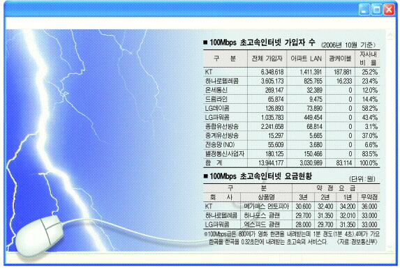 초고속인터넷 속도경쟁은 후발사업자로 시장에 참여한 LG파워콤이 촉발시켰다.LG파워콤은 올해 아파트지역에서 100Mbps급 ‘엑스피드’ 광랜으로 공략, 재미를 톡톡히 봤다.