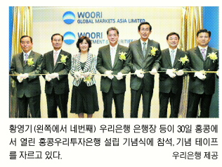 |홍콩 이창구특파원|국내 은행이 세계 자본의 ‘정글’인 홍콩에서 본격적으로 자본 사냥에 나섰다. 우리은행은 30일 홍콩에서 한국계 최초의 역외 투자은행(IB)인 홍콩우리투자은행 설립 기념식을 가졌다. 기념식에는 우리은행 경영진뿐 아니라 홍콩 금융감독당국 부총재, 씨티그룹, 골드만삭스,JP모건 등 전세계 유수의 IB 아시아·태평양지역 최고경영자들이 참석해 관심을 보였다.
