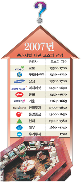 지금까지 가장 높은 전망치를 제시한 곳은 교보증권으로 코스피지수 1780이다. 교보증권 박석현 연구원은 “신흥시장과 함께 국내 증시의 재평가과정이 계속될 것”이라고 밝혔다. 코스피 최고점을 증권사 중에서 가장 낮은 1580으로 제시한 현대증권 한동욱 연구원도 올해 부진했던 정보기술(IT)업종이나 건설업이 내년에는 나아질 것이라고 전망했다.