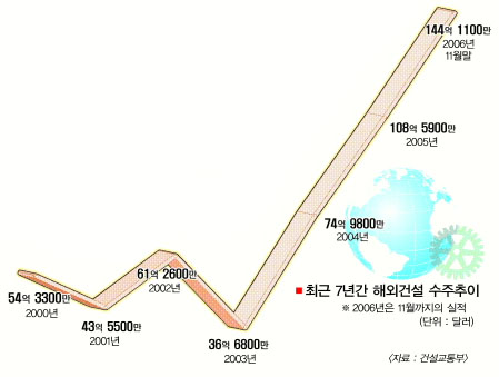 건교부 관계자는 “지난 65년 해외에 첫 진출한 이후 올해로 41년째인 해외건설은 70년대 중반까지의 개척기를 거쳐 70년대 말과 80년대 초의 양적 팽창기를 거쳤다.”면서 “90년대 말 외환위기로 주저앉았다가 화려하게 부활해 다시 전성기를 맞고 있다.”고 말했다.