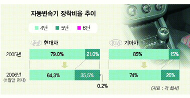 기아차도 5단 비중을 지난해 15%에서 올해 26%로 끌어올리며 단수 경쟁에 가세했다. 특히 대형세단 뉴오피러스에 5단을 얹어 재미를 톡톡히 봤다.