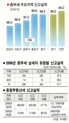 국세청은 지난 1∼15일 종부세 신고·납부기간에 신고대상 인원 34만 8000명 가운데 97.7%인 34만명이 자진 신고한 것으로 잠정 집계됐다고 19일 발표했다. 앞으로 우편신고분까지 합치면 최종 신고율은 이보다 조금 더 높을 것으로 예상된다. 올해 종합소득세 90.9%나 법인세 92.1%, 부가가치세 89.6% 등의 신고율보다 높다.