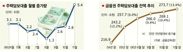 금감원 김중회 부원장은 “12월 이후는 주택담보대출이 계절적 비수기에 접어들고 11·15 부동산 대책, 은행들의 영업 자제, 대출 심사 때 채무 상환 능력 반영 등으로 대출 증가세가 둔화될 것”이라고 전망했다.11월말 현재 금융권 전체 주택담보대출은 전월보다 5조 4000억원 늘어난 275조 7000억원이다. 이중 은행이 78%, 보험이 5.1%, 저축은행·상호금융 등 비은행이 18.3%를 차지한다.