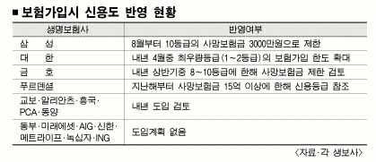 교보·흥국·알리안츠·PCA·동양생명 등도 이같은 방안을 검토 중이다. 도입하면 지난 8월 보험가입 때 신용등급을 반영한 삼성생명의 방안이 유력하다. 삼성생명은 신용등급 10등급 가입자는 사망보험금 최고한도를 3000만원으로 제한했다. 단 어린이보험 가입자, 계약을 2년 이상 유지한 계약자, 선납이나 일시납 등으로 납입능력이 증명된 경우 등은 신용등급을 반영하지 않고 있다.
