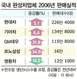 완성차 5개사는 지난 한해동안 총 581만 9907대를 팔았다. 전년(521만 9659대)보다 11.5% 늘었다. 회사별로는 현대차가 총 266만 3998대를 팔았다. 전년보다 5.1% 늘었다. 국내 시장점유율도 2004년부터 3년째 50%를 이어갔다. 하지만 당초 목표(268만 9000대)에 2만 5000대 가량 못미쳐 빛이 바랬다. 내수 판매량이 전년보다 겨우 1.8% 늘어난 58만 1092대(목표치 63만대)에 그친 탓이 컸다.
