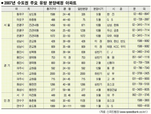 분양가 상한제, 재건축 후분양 등으로 올해 분양시장 전망이 어느 때보다 불투명하지만 노려봄직한 수도권 유망 물량이 적지 않다. 올해 서울 은평뉴타운, 경기 용인 흥덕, 화성 동탄, 판교신도시, 광교신도시, 인천 송도신도시·검단신도시 등 유망 물량이 많이 나온다.