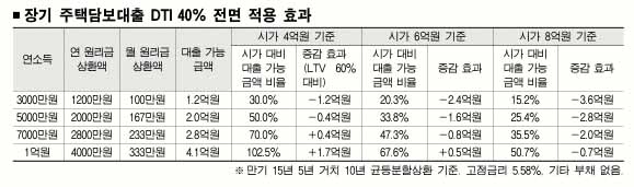 전 금융권에서 총부채상환비율(DTI) 40%를 적용하면 일단 부동산 광풍을 잡는 데는 효과가 있을 것으로 보인다. 그러나 내집 마련이나 사업 용도로 대출을 받으려는 실수요자와 영세 사업자들이 되레 피해를 볼 수 있다는 우려도 제기되고 있다.