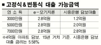 연소득 3000만원인 직장인이 시가 4억원의 아파트를 담보로 하고 만기 15년 조건으로 일반 담보대출로 받을 수 있는 대출 금액은 최대 1억 2000만원. 반면 e-모기지론을 통해서는 2억 4000만원까지 대출이 가능하다. 연봉 5000만원 직장인 역시 일반 담보대출보다 e-모기지론으로 8000만원을 더 받을 수 있다.