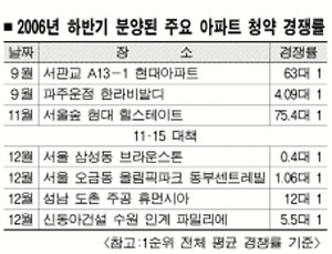 지난해 12월 대한주택공사가 성남 도촌에서 분양한 휴먼시아(32평형 평당 957만원)는 12대1의 경쟁률을 기록하며 1순위 마감됐다. 전매제한 규제를 받지 않아 인기가 더 높았다. 대림산업이 같은달 용인 마북지구에서 분양한 e편한세상도 34평형(평당 1200만원)은 지역우선 순위에서만 37대1의 경쟁률을 기록했다.