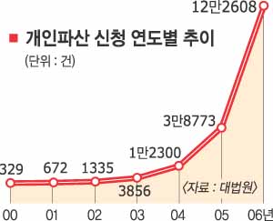 7일 대법원에 따르면 지난해 개인파산 신청 건수는 12만 2608건에 달했다.2005년 3만 8773건에 비해 크게 늘어난 것은 물론 2002년(1335건)에 비해서는 4년만에 무려 90배 이상 급증했다.