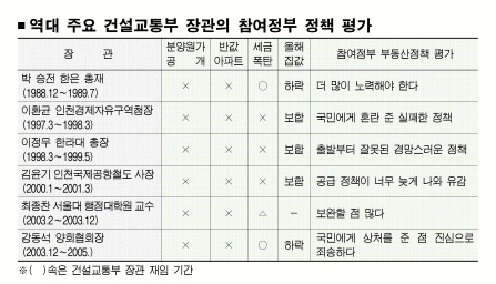 김영삼·김대중 대통령 시절은 물론 현 노무현 대통령 시절의 건설교통부 장관들도 대체로 참여정부의 부동산 대책은 실패라고 말했다. 최근 논란이 되고 있는 분양원가 공개와 소위 반값 아파트(토지임대부·환매조건부 분양)에 대해서는 부정적인 의견이 많았다. 보유세와 양도소득세를 강화하는 조세 정책에 대해서는 찬반이 엇갈렸다. 서울신문이 8일 박승·이환균·이정무·김윤기·최종찬·강동석 전 건설교통부장관을 상대로 설문 조사를 실시한 결과다.