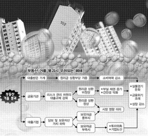정부는 조심스러운 입장이다. 거품을 인정하자니 부동산 정책 실패를 시인하는 것 같고, 부정하자니 현실 인식 능력이 부족하다는 비판을 받을 수 있기 때문이다. 그래서 증시의 주당순이익(PER)에 빗대어 거품을 부분적으로 인정했다. 예컨대 20억원짜리 집을 보유하는 것은 연이율 5%를 감안할 때 1년에 1억원의 수익을 올려야 하는데 실제로는 그렇지 못해 거품은 있다는 것. 다만 지금까지 자본이익을 통해 그 이상의 수익을 올려 거품으로 보이지 않았으나 집값이 안정되면서 자본이익 기대치도 줄어 거품이 두드러져 보인다는 논리다.