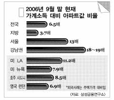 선진국에 비해서는 최고 2배 정도 거품이 끼었다는 지적도 나온다. 고종완 RE멤버스 대표는 “소득 대비 주택가격지수(PTI)를 보면 미국과 영국, 캐나다는 1년 연봉의 9∼10배인데 한국의 강남권은 18∼19배에 이른다.”면서 “강남권은 선진국의 2배 정도가 거품으로 보인다.”고 말했다.
