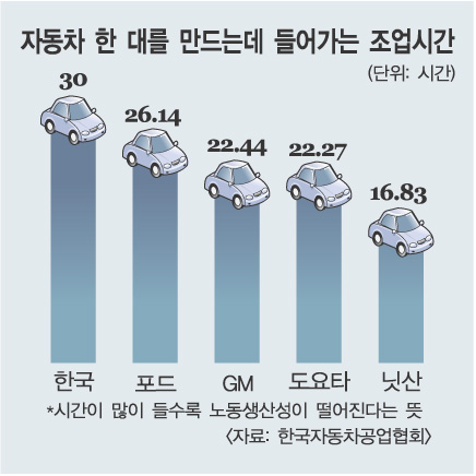 자동차 1대당 투입되는 조업시간을 토대로 산출한 노동 생산성을 따져볼 때, 우리나라는 30시간이다.