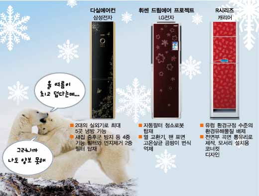 올 신제품들의 디자인 경쟁도 놓칠 수 없는 눈요깃거리다. 삼성전자의 하우젠은 앙드레 김의 디자인을 입었으며 LG전자의 휘센은 스와로브스키의 디자인으로 수놓았다.