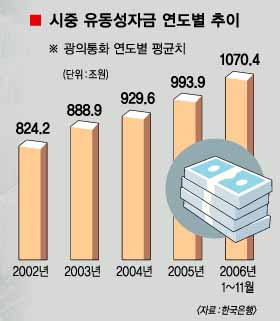 최근 한국은행 조사에 따르면 지난해 은행의 가계대출 증가액은 40조 9000억원. 카드 사태로 우리 경제가 휘청거렸던 2002년 61조 6000억원 이후 최고치를 기록했다. 이 가운데 주택담보대출은 26조 8000억원이 늘어나면서 217조 410억원을 기록했다. 증가폭도 2002년 45조 5000억원 이후 가장 컸다. 현재 시장에 유동성이 얼마나 많이 풀려 있는지 보여준다.