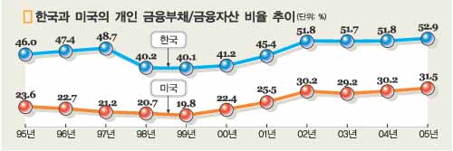 이 연구원은 한국의 금융자산대비 개인의 금융부채비중은 52.9%로 미국(31.5%)이나 일본(26%), 영국(35%), 타이완 (17%)보다 약 20%포인트 높아 상환능력이 떨어진다고 설명했다.