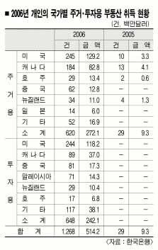 이는 전년의 47건,2270만달러보다 건수와 금액이 각각 51배,34배나 늘어난 것이다. 이중 개인의 부동산(주택·상가) 취득은 1268건,5억 1000만달러로 전체의 66%를 차지했다.2005년의 930만달러(29건)와 비교할 때 금액기준으로 55배(건수는 44배)가 폭증했다.