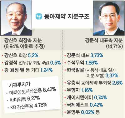 유 부회장의 이탈은 앞으로 동아제약 내부에 적지 않은 파장을 불러올 전망이다. 유 부회장의 이탈이 강 회장에게는 원로들의 충성과 지지를 잃게 되는 결정타가 될 수 있기 때문이다. 강 대표는 확실한 의결권 확보를 위해 동아제약 지분을 보유한 미래에셋자산운용(8.42%),KB자산운용(4.78%) 등과 접촉 중인 것으로 알려졌다. 오는 3월로 예정된 정기 주주총회에서 부자간의 승패는 결정난다.