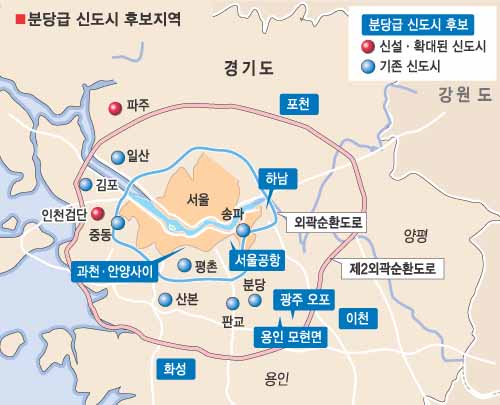 업계 관계자는 “양주 신도시도 신도시로서 외면받는 상황에서 제2외곽 순환도로 인근의 용인, 화성, 포천, 이천 등은 강남 수요를 대체할 분당급 신도시로 보기에 부족한 감이 크다.”면서 “과천, 성남비행장이나 하남 정도에서 나와야 강남수요를 흡수할 수 있지만 이들을 신도시로 지정하기엔 과제가 많다.”고 말했다.