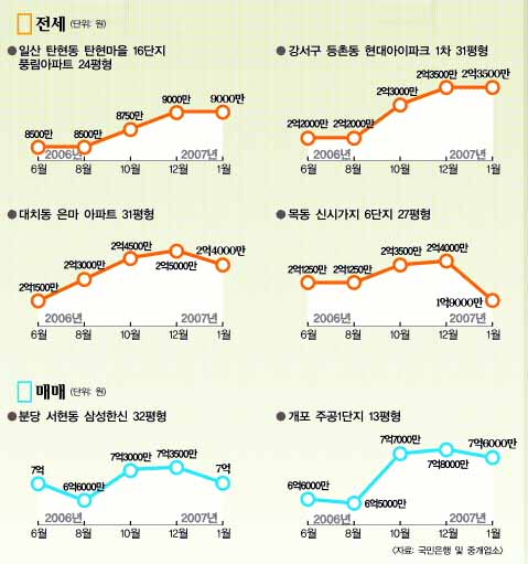 강남의 경우 삼성동 래미안 31평형 전세는 지난해보다 오히려 1000만∼2000만원가량 오른 3억 7000만원에 나와 있다. 대치동 은마아파트도 34평형이 연말이나 최근 모두 13억 5000만원에 호가돼 아직은 변화를 찾기 어렵다.