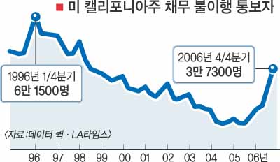 로스앤젤레스 타임스가 24일(현지시간) 모기지론(주택담보대출) 상환을 하지 못해 몇차례 체불 통지를 받다 끝내 압류 조치를 당하는 캘리포니아주 주민들의 상황을 보도하면서 소개한 한 사례다. 신문은 주택정보 제공사인 ‘데이터퀵 정보 시스템스’ 자료를 토대로 지난해 4·4분기 체불자가 모두 3만 7273명이었다고 보도했다. 주택경기가 하락세를 타기 시작한 2005년 같은 기간의 1만 5196명에 비해 무려 145%나 급증한 수치다. 최근 인터내셔널헤럴드트리뷴 등 미 언론들은 부동산 경기 침체(일각에선 거품 붕괴로 표현)로 인한 이 같은 상황이 미 전역의 문제로 소비를 위축시켜 경기에 상당한 악영향을 미칠 것이란 분석을 제시해 왔다.