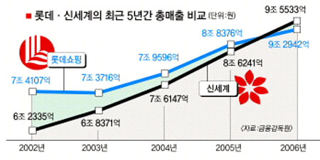 ‘유통 라이벌’인 두 그룹의 주력 회사에서 신세계가 롯데를 앞선 것은 1981년 이후 25년 만에 처음이다.1979년 서울 소공동 본점을 개점한 롯데는 1981년 신세계를 총매출에서 추월했다. 이후 줄곧 유통정상을 지켜왔다.