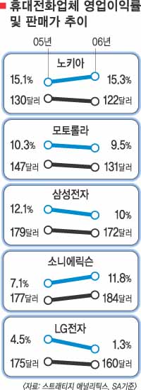 26일 업계에 따르면 지난해 세계 5대 메이저 휴대전화 제조업체의 성적표는 ‘노키아는 선두 고수, 모토롤라 후퇴, 삼성전자 약보합, 소니에릭슨 약진,LG전자 후퇴’로 요약된다. 모토롤라는 주력인 저가폰 시장에서 참패했고, 소니에릭슨은 고가폰 시장에서 삼성전자의 아성을 위협할 만큼 선전했다. 모토롤라의 실적 내용은 ‘속 빈 강정’이었다. 지난해 4·4분기 매출은 78억달러로 전년 대비 19%가량 증가했다. 하지만 수익 마진은 49% 줄어들었다. 이익률은 10%대에서 4.4%로 추락했다.