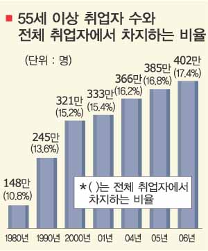 지난해 55세 이상 취업자 수는 402만 5000명으로 2005년보다 4.5% 늘었다. 지난해 전체 취업자의 17.4%에 해당된다.