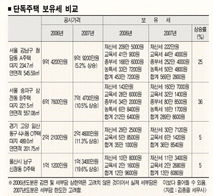 6억원 초과 고가주택은 종합부동산세와 재산세 등에서 지난해보다 세금부담이 늘어날 전망이다. 예컨대 서울 강남구 청담동 A단독주택(대지 234.7㎡)의 지난해 공시가격은 9억 4200만원에서 올해는 9억 9200만원으로 5.2%가 올랐다. 이 주택 소유자는 재산세와 종부세·교육세·농어촌특별세 등을 포함한 보유세(도시계획세 제외)를 지난해 453만 7200원 냈으나 올해에는 569만 2800원을 내야 할 전망이다. 전년보다 25%(115만 5600원) 늘어난 금액이다.