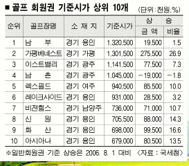 골프 회원권 기준시가는 2004년말 고시 때 9.1% 하락한 뒤 2005년 8월 고시 때 11.6%나 급등했고, 지난해 2월에는 6.8%,8월에는 5.6% 각각 올랐다.