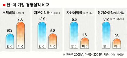 그러나 전문가들은 낮은 부채비율은 국내 기업들의 저조한 투자 분위기를 반영하는 것이며 영업이익률은 지난 10년 동안 제자리걸음을 하고 있다고 반박했다.2005년 법인세를 신고한 국내 법인 32만 2882개와 2004년 법인세를 신고한 미국 기업 516만 6401개를 비교대상으로 했다.