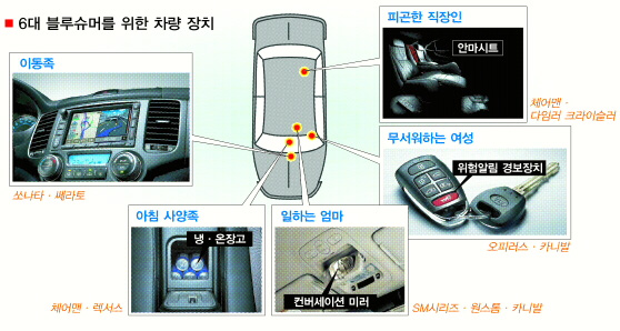 얼마 전 통계청이 앞으로 뜰 6대 ‘블루슈머’ 집단을 발표해 큰 화제가 됐었다. 자동차업계도 이 블루슈머에 눈독을 들이고 있다. 블루슈머란 ‘블루 오션’과 ‘컨슈머’의 합성어다. 경쟁자가 아직 많지 않은 시장(블루 오션)의 소비자(컨슈머)를 뜻한다.▲이동족▲ 무서워하는 여성 ▲아침 사양족 ▲피곤한 직장인 ▲일하는 엄마 ▲살찐 한국인이 그것이다. 자동차를 뜯어보면 이들을 겨냥한 장치가 적지 않다. 블루슈머가 반향을 일으키면서 이들을 자동차 속에 끌어들이려는 연구·개발 움직임이 더욱 활발해지고 있다.