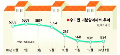 6일 닥터아파트에 따르면 지난달 말 서울·경기·인천 등 수도권 미분양 아파트 물량은 총 1294가구로 전달인 2006년 12월(1081가구)보다 213가구 늘어났다.