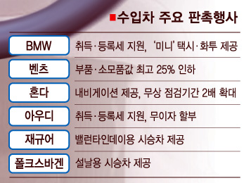 이렇듯 수입차업계가 경쟁적으로 판촉 행사를 벌이는 것은 한창 달아오른 국내 시장을 확실하게 선점하기 위해서다. 이달이 비수기인 점도 감안했다. 수입차는 지난달에만 국내시장에서 4만 365대가 팔렸다.1월이 비수기인데도 사상 최고의 월간 기록을 세웠다. 시장점유율도 처음으로 5%대(5.3%)를 돌파했다. 지난해 시장점유율은 4.2%(판매대수 4만대)였다.