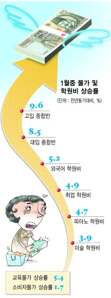 서울 특정지역만의 얘기가 아니다. 경기도 분당의 한 미술학원은 지난달 초등학생의 월 수강료를 9만원에서 10만 8000원으로 20%나 올렸다. 지난달 소비자물가 상승률은 1%대로 안정세를 보였지만 각종 학원비는 크게 올라 학부모들의 교육비 부담이 연초부터 가중되고 있다.